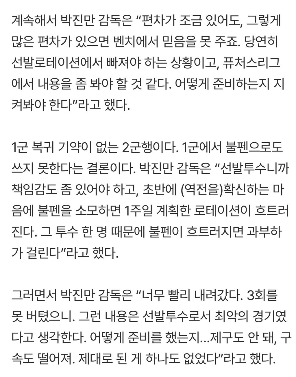 박진만, “선발 투수로서 최악, 제대로 된 게 하나도 없었다” 작성자경찰청장|작성시간26.04.09|조회수494 목록 댓글 3 글자크기 작게가 글자크기 크게가 기약없는 2군행.. 진짜 빡쳐서 벌투 시켰나봄 ㄷㄷ 다음검색 현재 게시글 추가 기능 열기 북마크 공유하기 신고 센터로 신고 댓글 댓글 3 댓글쓰기 답글쓰기 댓글 리스트 작성자모두헬스합시다!!! | 작성시간 26.04.09 강판되고 들어갈때 코칭스태프들 쳐다도 안보던데 작성자음킨 | 작성시간 26.04.09 워딩 겁나 쎄네 2군은 당연히 갈 거 같았음… 작성자The theatre of dreams | 작성시간 26.04.10 ㄷㄷ 댓글 전체보기