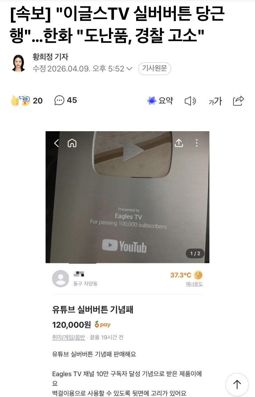 [야구]이글스TV 실버버튼 당근에 등장 작성자주바페|작성시간26.04.09|조회수340 목록 댓글 7 글자크기 작게가 글자크기 크게가 https://naver.me/Ix0DdUQ1[속보] "이글스TV 실버버튼 당근행"…한화 "도난품, 경찰 고소"프로야구 한화이글스 유튜브 채널 '이글스TV'의 실버버튼이 중고거래 플랫폼에 올라왔다는 글이 확산된 가운데 해당 물품이 도난된 것으로 확인됐다. 9일 한 야구 커뮤니티에는 '이글스TV 유튜브n.news.naver.com 다음검색 현재 게시글 추가 기능 열기 북마크 공유하기 신고 센터로 신고 댓글 댓글 7 댓글쓰기 답글쓰기 댓글 리스트 작성자원희양 | 작성시간 26.04.09 구단 직원이 올린거임? 답댓글 작성자카리나 네뷸라 | 작성시간 26.04.09 신구장으로 옮기는 과정에서 분실했대요 작성자이태석이승준 | 작성시간 26.04.09 바본가 ㅋㅋㅋㅋㅋㅋㅋ 저거 올리면 바로 아이디 추적해서 잡힐텐데 작성자H_Crespo | 작성시간 26.04.09 진짜 교도소밥 제대로 먹여야. 작성자중고차파괴자 | 작성시간 26.04.09 내부직원소행일듯 댓글 전체보기