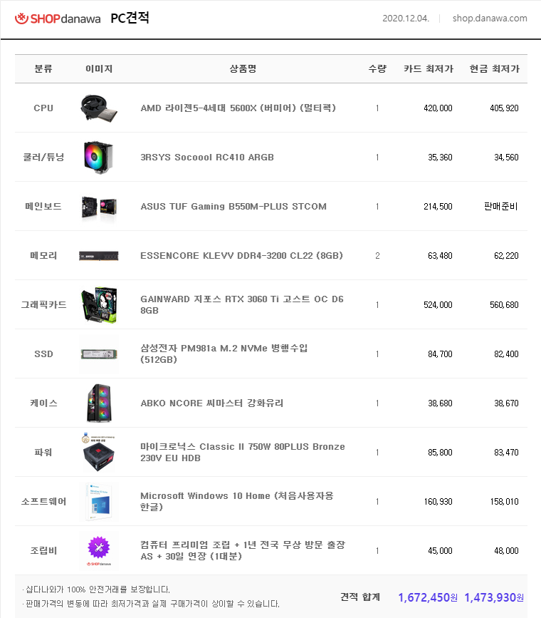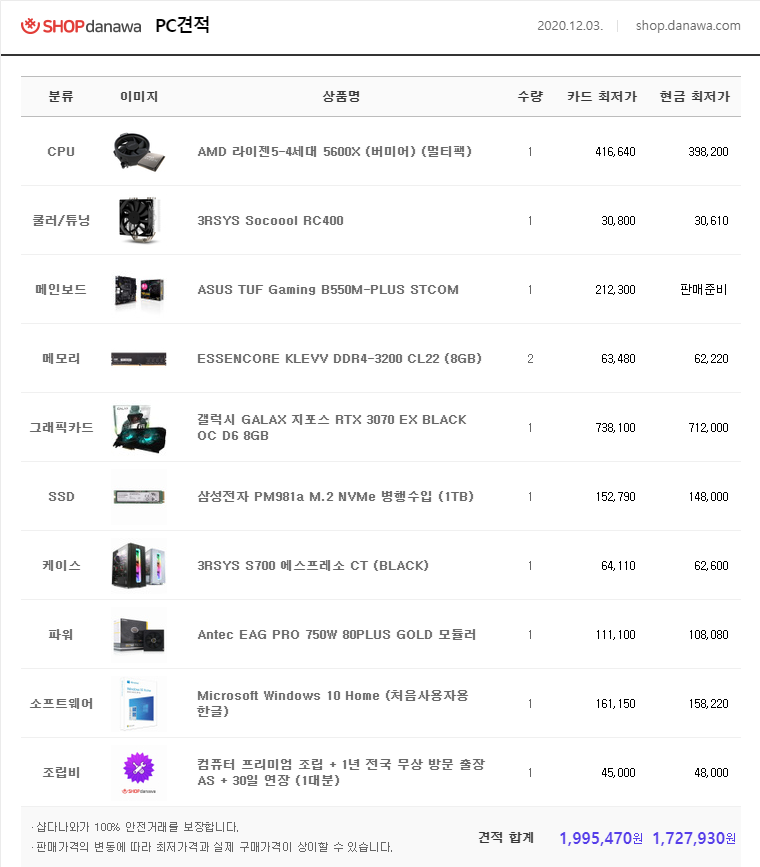 ** 2020.12.03 일부제품 기가바이트 B550M AORUS PRO-P 메인보드 전원꺼짐 이슈가 있어서 견적예시 긴급 수정