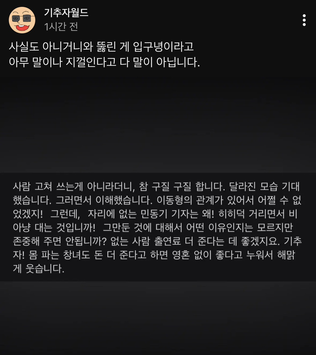 작성자Evan 작성시간 26.03.28 참 말을해도 저게 뭐냐. 비판도 좀 가려가면서 해라. 그리고 저사람 이이제이 초반부터 팬이어서 이동형 쉽게 못버림. 그냥 구독끊고 안보면되지 굳이 가서 저런 더러운 댓글을 쓰냐