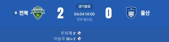[움짤][2026 K리그1 6R] 전북 현대 vs 울산 HD FC 골장면.gif 작성자음교수|작성시간26.04.04|조회수177 목록 댓글 2 글자크기 작게가 글자크기 크게가 다음검색 현재 게시글 추가 기능 열기 북마크 공유하기 신고 센터로 신고 댓글 댓글 2 댓글쓰기 답글쓰기 댓글 리스트 작성자정예린2 | 작성시간 26.04.04 전북 이겼다 작성자아엠어굿보이 | 작성시간 26.04.04 와 이승우 뭐야 댓글 전체보기