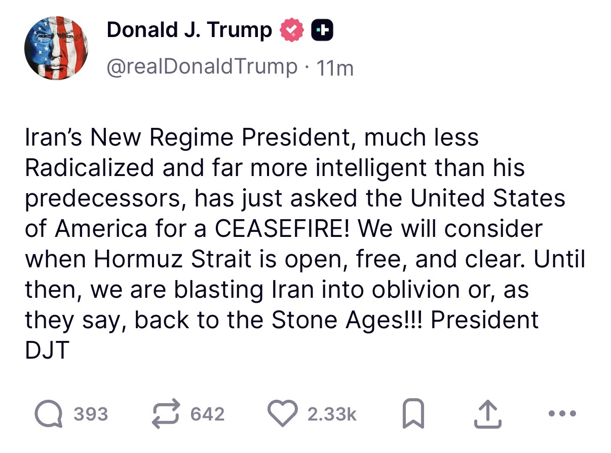 트럼프, 호르무즈 개방 안하면 이란을 석기시대로 작성자Luka Modric|작성시간26.04.01|조회수433 목록 댓글 2 글자크기 작게가 글자크기 크게가 이란이 휴전 요청했지만 호르무즈해협이 안전할 경우에만 받아들이겠다 다음검색 현재 게시글 추가 기능 열기 북마크 공유하기 신고 센터로 신고 댓글 댓글 2 댓글쓰기 답글쓰기 댓글 리스트 작성자그로구 | 작성시간 26.04.01 아니 왜 석기시대같은 쓸데없는말을 한겨 타코놈아 작성자아이콘앙리5카 | 작성시간 26.04.01 금욜날 종배타야지~ 주말에 종전나올듯 댓글 전체보기