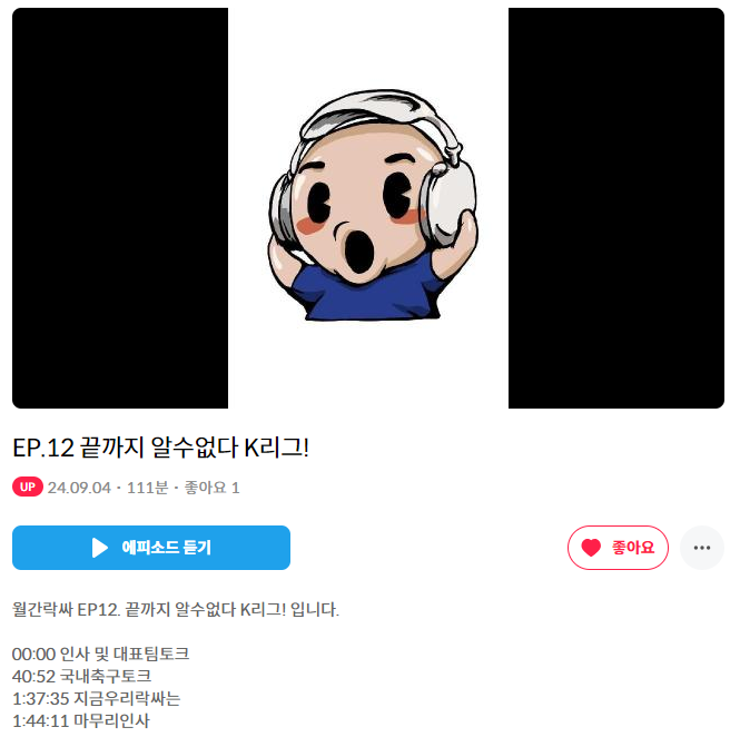 EP.12 끝까지 알수없다 K리그! 작성자Professor|작성시간24.09.04|조회수30,202 목록 댓글 4 글자크기 작게가 글자크기 크게가 https://www.podbbang.com/channels/1788027/episodes/24993342EP.12 끝까지 알수없다 K리그!월간락싸 EP12. 끝까지 알수없다 K리그! 입니다. 00:00 인사 및 대표팀토크 40:52 국내축구토크 1:37:35 지금우리락싸는 1:44:11 마무리인사www.podbbang.com 다음검색 현재 게시글 추가 기능 열기 북마크 공유하기 신고 센터로 신고 댓글 댓글 4 댓글쓰기 답글쓰기 댓글 리스트 작성자바이언2 | 작성시간 24.09.04 작성자Alexis Sanchez | 작성시간 24.09.04 작성자FranzBeckenbauer | 작성시간 24.09.05 작성자보라빛 밤 | 작성시간 24.09.13 댓글 전체보기