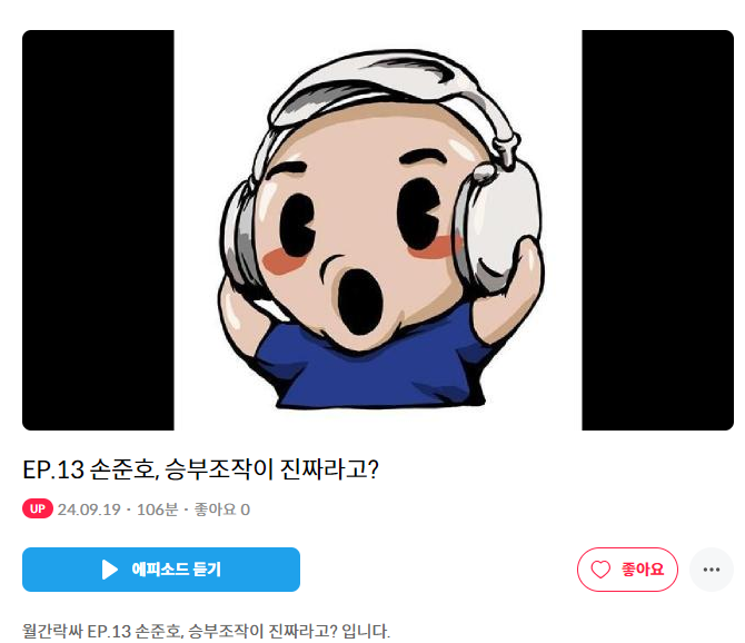 EP.13 손준호, 승부조작이 진짜라고? 작성자Professor|작성시간24.09.19|조회수39,915 목록 댓글 11 글자크기 작게가 글자크기 크게가 https://www.podbbang.com/channels/1788027/episodes/25000412EP.13 손준호, 승부조작이 진짜라고?월간락싸 EP.13 손준호, 승부조작이 진짜라고? 입니다. 00:00 인트로 및 대표토크 36:27 국내토크 1:22:39 지금우리락싸는 1:24:38 해외토크 1:42:03 마무리인사www.podbbang.com 다음검색 현재 게시글 추가 기능 열기 북마크 공유하기 신고 센터로 신고 댓글 댓글 11 댓글쓰기 답글쓰기 댓글 리스트 작성자김민주 | 작성시간 24.09.19 오! 올라왔군요 작성자Tensegrity Universe and Philosophy | 작성시간 24.09.20 재밌었어요 작성자Florence Pugh | 작성시간 24.09.23 작성자추아메니 | 작성시간 24.09.27 작성자I’d rather be ashes than dust | 작성시간 24.10.08 와 조횟수 미쳤 댓글 전체보기