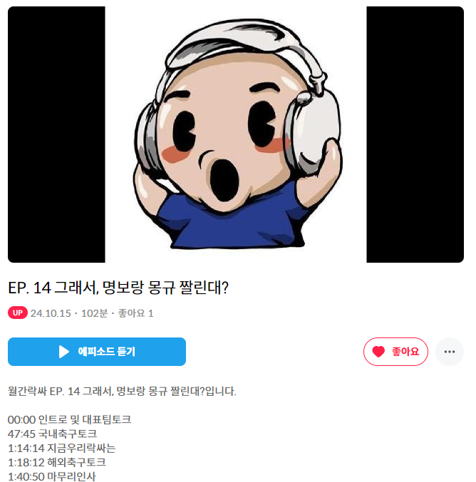 EP. 14 그래서, 명보랑 몽규 짤린대? 작성자Professor|작성시간24.10.15|조회수41,460 목록 댓글 7 글자크기 작게가 글자크기 크게가 https://www.podbbang.com/channels/1788027/episodes/25014381EP. 14 그래서, 명보랑 몽규 짤린대?월간락싸 EP. 14 그래서, 명보랑 몽규 짤린대?입니다. 00:00 인트로 및 대표팀토크 47:45 국내축구토크 1:14:14 지금우리락싸는 1:18:12 해외축구토크 1:40:50 마무리인사www.podbbang.com 다음검색 현재 게시글 추가 기능 열기 북마크 공유하기 신고 센터로 신고 댓글 댓글 7 댓글쓰기 답글쓰기 댓글 리스트 작성자장지현 해설위원 | 작성시간 24.10.15 와 다들 목소리 왜케 좋으심 ㄷㄷ 답댓글 작성자노지선 | 작성시간 24.10.16 감사합니다 하하…. 😄 작성자바이언2 | 작성시간 24.10.17 작성자FranzBeckenbauer | 작성시간 24.10.17 작성자I’d rather be ashes than dust | 작성시간 24.10.25 댓글 전체보기