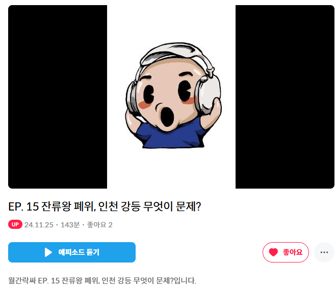 EP. 15 잔류왕 폐위, 인천 강등 무엇이 문제? 작성자Professor|작성시간24.11.25|조회수24,620 목록 댓글 4 글자크기 작게가 글자크기 크게가 https://www.podbbang.com/channels/1788027/episodes/25048404EP. 15 잔류왕 폐위, 인천 강등 무엇이 문제?월간락싸 EP. 15 잔류왕 폐위, 인천 강등 무엇이 문제?입니다.www.podbbang.com 다음검색 현재 게시글 추가 기능 열기 북마크 공유하기 신고 센터로 신고 댓글 댓글 4 댓글쓰기 답글쓰기 댓글 리스트 작성자그무언가 | 작성시간 24.11.25 하 가슴아픔 작성자바이언2 | 작성시간 24.11.26 작성자사람이어떻게음주운전2번 | 작성시간 24.11.26 물병이 문제 작성자GFYS | 작성시간 24.11.26 실력미달이라 강등된것 댓글 전체보기