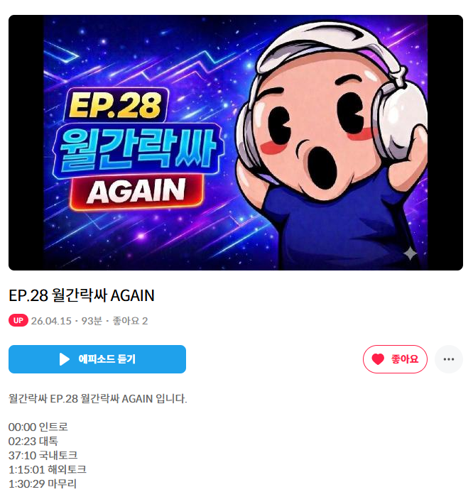 EP. 28 월간락싸 AGAIN 작성자Professor|작성시간26.04.15|조회수2,506 목록 댓글 7 글자크기 작게가 글자크기 크게가 https://youtu.be/NQVJwVzS8ng?si=8MnR52Pyb3cV-MKfhttps://dlink.podbbang.com/b90fe985EP.28 월간락싸 AGAIN월간락싸 EP.28 월간락싸 AGAIN 입니다. 00:00 인트로 02:23 대톡 37:10 국내토크 1:15:01 해외토크 1:30:29 마무리www.podbbang.com 다음검색 현재 게시글 추가 기능 열기 북마크 공유하기 신고 센터로 신고 댓글 댓글 7 댓글쓰기 답글쓰기 댓글 리스트 작성자에라스네츠 | 작성시간 26.04.15 작성자바이언2 | 작성시간 26.04.15 작성자구구 | 작성시간 26.04.15 작성자奇誠庸 | 작성시간 26.04.15 유튜브도 있군요 구독 눌렀음 구독 많이 필요하네요 ㄱㄱㄱㄱㄱㄱ 작성자ArsenalFC | 작성시간 26.04.19 댓글 전체보기