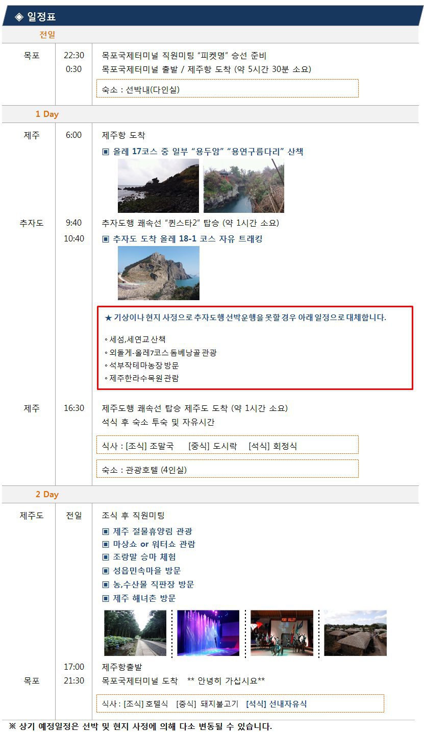 추자도와 제주도 올레길을 걸으며, 제주도 관광을 함께하는 일정입니다.