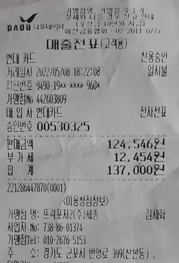 (바베큐 2x3만, 6만+파전 2x1.5천, 3만+열무국수1x7천+잔치2, 1만+동동1만, 濁5, 2만, 오뎅等 서비스)
