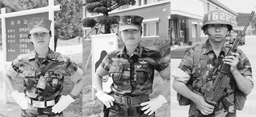 해병대 최초의 여성 DI 이지애 하사, 첫 여성 훈련소대장 이미희 중위, 영국 국적과 홍콩 시민권을 팽개치고 입대한 장호재 훈병(왼쪽부터).