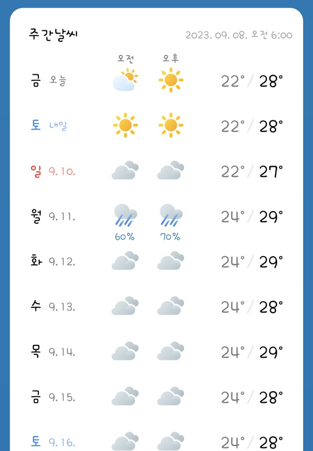 작성자[총무부장]1255배진환모예비역 작성시간 23.09.08 인섭맘님 날씨 정보 감사합니다~ 좋은 날 되세요❤️