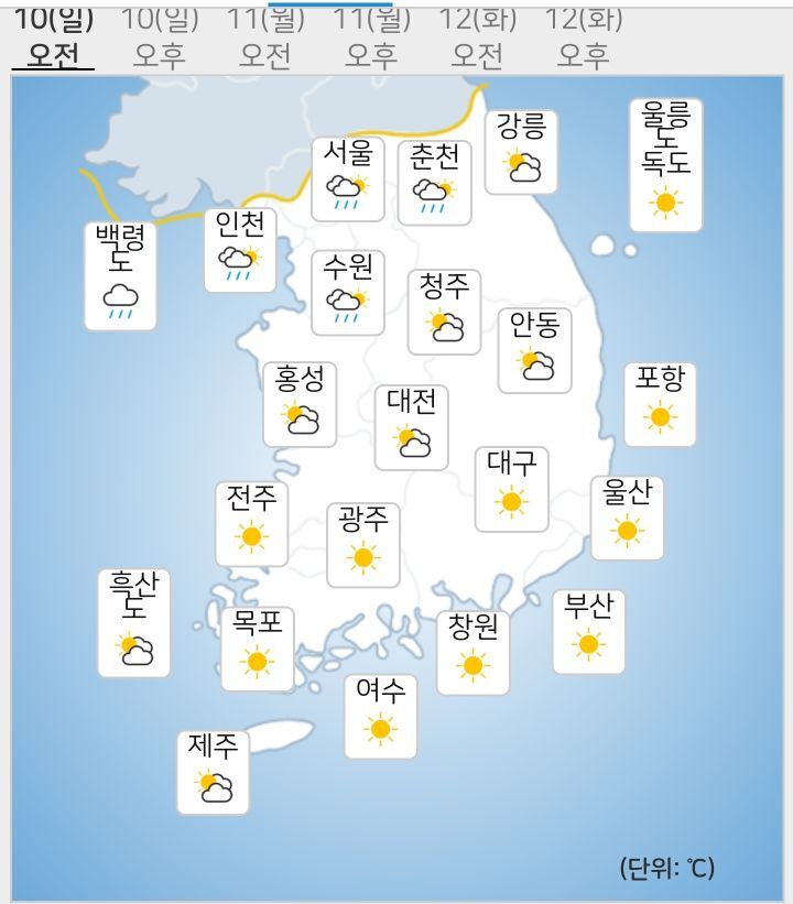- 또한, 오늘부터 모레(12일) 사이에 비가 오는 지역에서는 가시거리가 짧고 도로가 미끄럽겠으니, 교통안전에 각별히 유의하기 바랍니다.