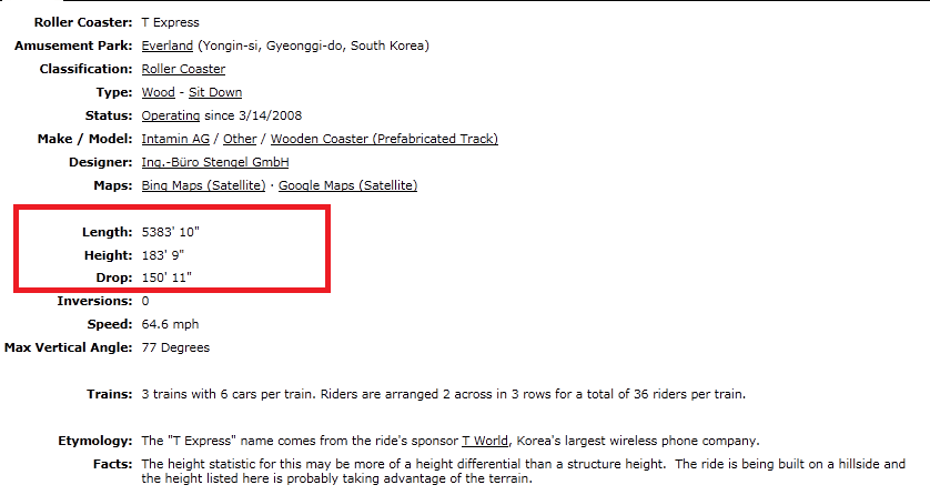 롤러코스터 데이터베이스 : RCDB - http://www.rcdb.com/3938.htm
