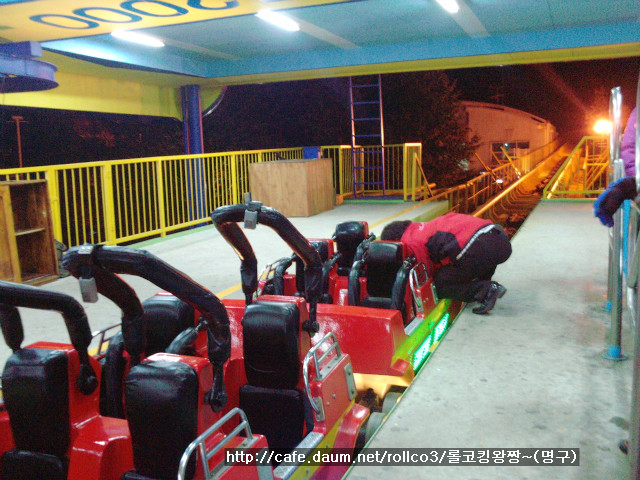 4. [안전바를 내리게 한 후]안전바를 내려주세요, 아 안전바가 뭔지 모르신다구요? 안전바는 가까운곳에 있습니다. 머리윗쪽에 시커먼거 있죠? 그게 안전바입니다. 그걸 내려주세요. 아아아 이 서울랜드는 모든게 수동입니다. 자동이 하나도없어요 안전바를 내릴때도 또한 올릴때도 다 수동입니다. 안전바 꽉 내려주세요,, 헐렁헐렁한다고 좋아하지마세요,,, 중간에 안전바가 풀리면 아름다운 일이 벌어질수도있습니다.(아름다운일이라,,, 사람추락하는걸 아름답다 표현하나? ㅋㅋㅋㅋ)