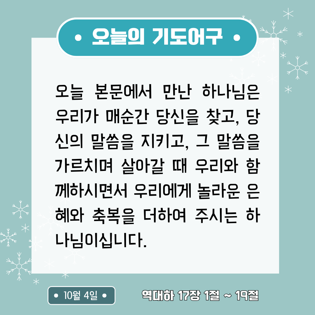 오늘의 기도어구: 당신을 찾고, 당신의 말씀을 지키고, 가르치며 살아가는 당신의 백성들과 함께하시면서 그들에게 부와 번영을 주시고, 더 큰 축복을 더하여 주시는 하나님