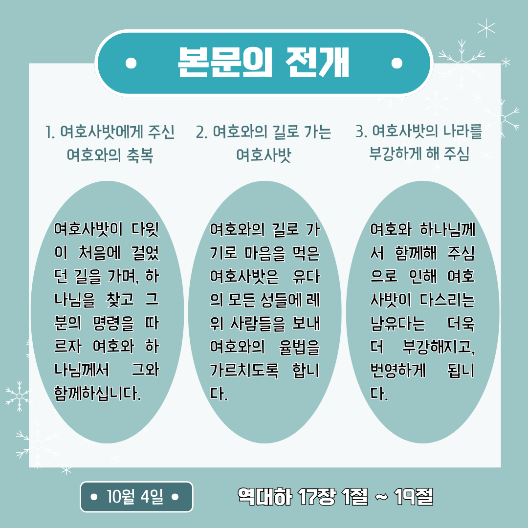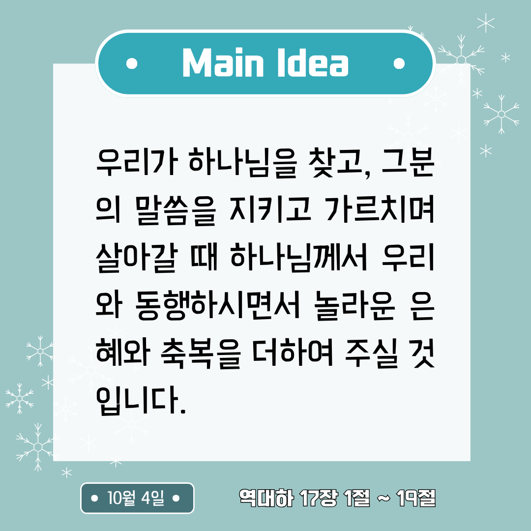(2) Main Idea: 우리가 하나님을 찾고, 그분의 말씀을 지키고 가르치며 살아갈 때 하나님께서 우리와 동행하시면서 놀라운 은혜와 축복을 더하여 주실 것입니다.