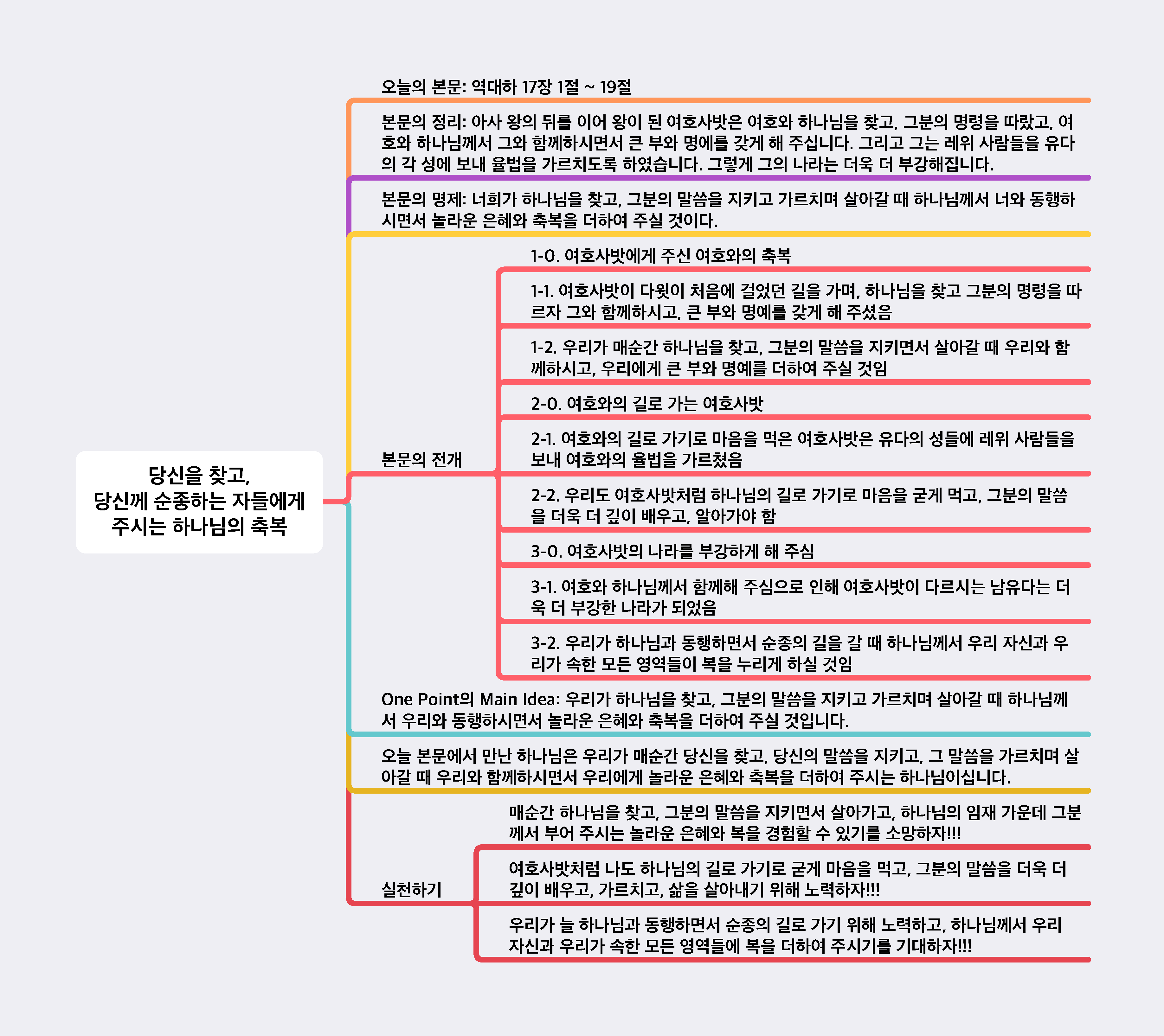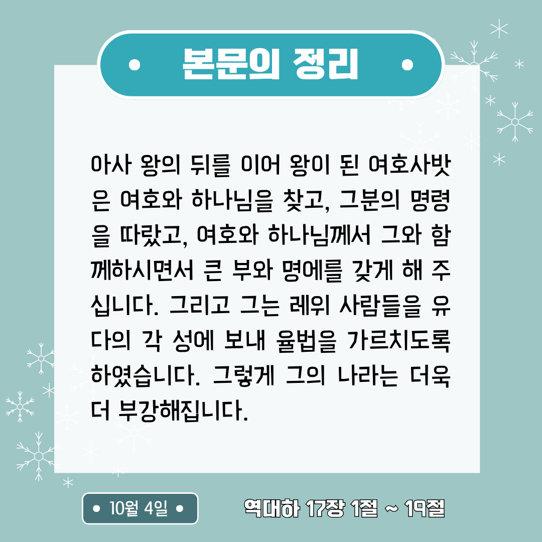 * 본문의 정리: 아사 왕의 뒤를 이어 왕이 된 여호사밧은 여호와 하나님을 찾고, 그분의 명령을 따랐고, 여호와 하나님께서 그와 함께하시면서 큰 부와 명에를 갖게 해 주십니다. 그리고 그는 레위 사람들을 유다의 각 성에 보내 율법을 가르치도록 하였습니다. 그렇게 그의 나라는 더욱 더 부강해집니다.
