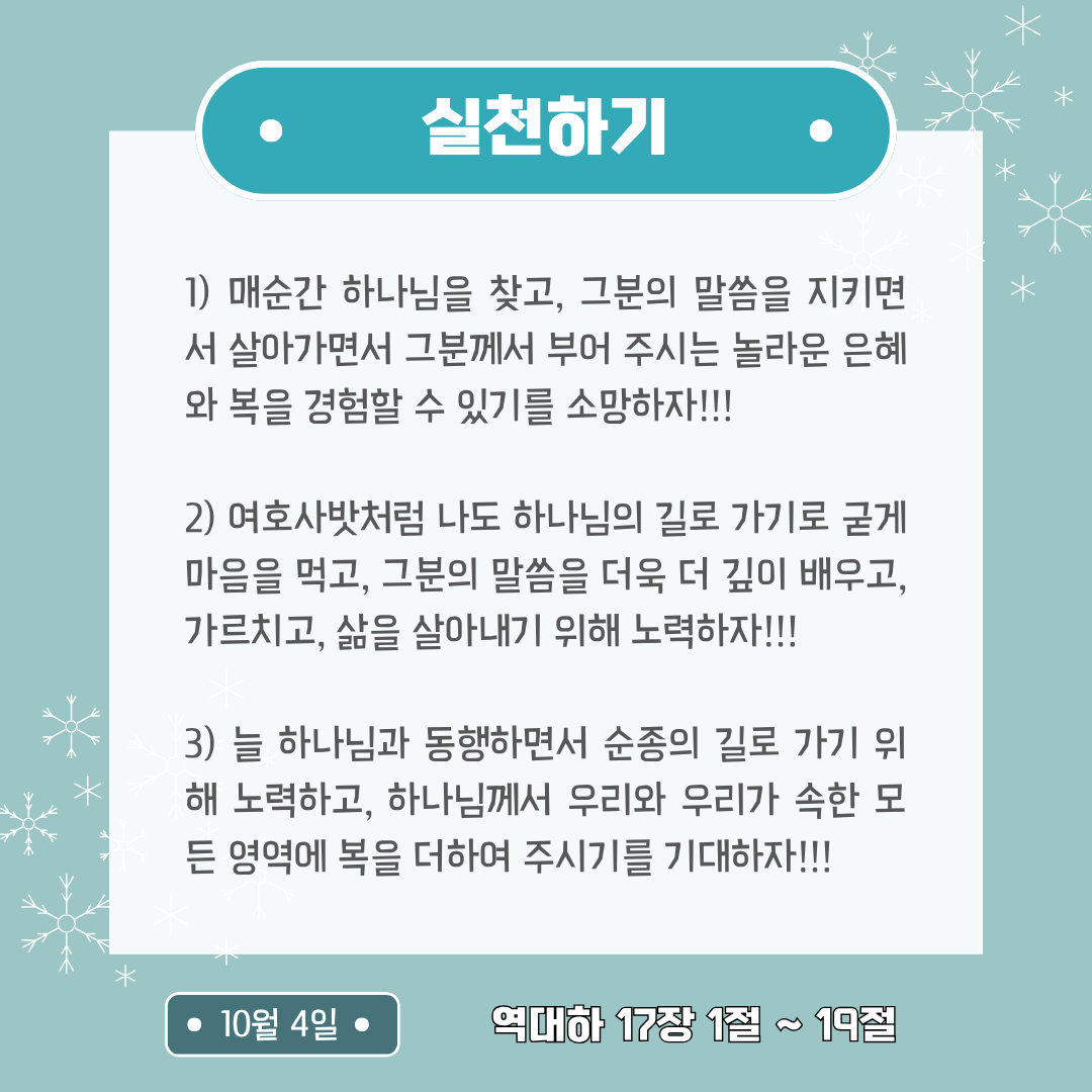 - 우리가 늘 하나님과 동행하면서 순종의 길로 가기 위해 노력하고, 하나님께서 우리 자신과 우리가 속한 모든 영역들에 복을 더하여 주시기를 기대하자!!!