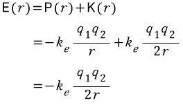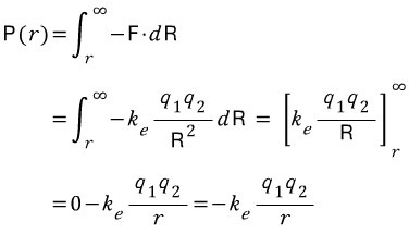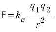 (k_e=쿨롱 상수, r은 두 전하 사이의 거리, q는 각 전하의 크기)