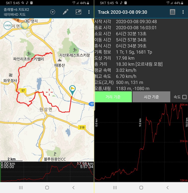 ★ 3/8일 산행 (노란색) : 가좌리버스정류장~문수봉~곱든고개~칠봉산~독조봉~평창사거리 / 18 km