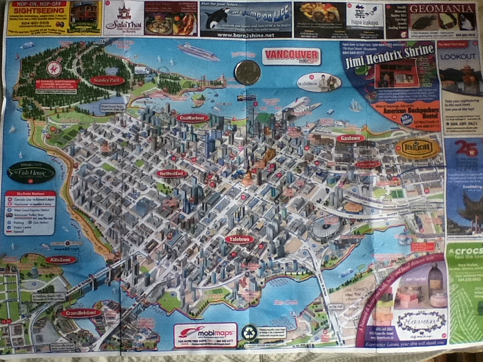 가장 흔하고 편리한 벤쿠버 다운타운 지도입니다. 길 이름과 주요건물이 다 나와있습니다. 한번 구할 수 있을때 3장 이상 넉넉히 챙기세요. 정착초기에 너덜거릴때까지 계속 보게 될거예요 :) (크기를 가늠하기 위해 상단에 25센트 동전을 올려놓았습니다. 100원짜리 크기입니다.)