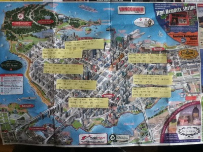 4. 선정된 집들의 위치,주소,가격,조건,전화번호,방문시간을 새끼손가락 사이즈 포스트잇에 적어 지도에 붙인다. Q: 집주소만 가지고 포스트잇을 지도에 어떻게 붙이나요? A: 캐나다는 St 개념이 발달 되어 있습니다. 방 구하실때 보면 위치 설명을 교차로로 설명합니다. ex)랍슨st,버라드st 교차지점. 이런식이죠. 바둑판처럼 도로가 나있기 때문에 포스트잇을 어디에 붙이실지 감이 오실거예요 ^^