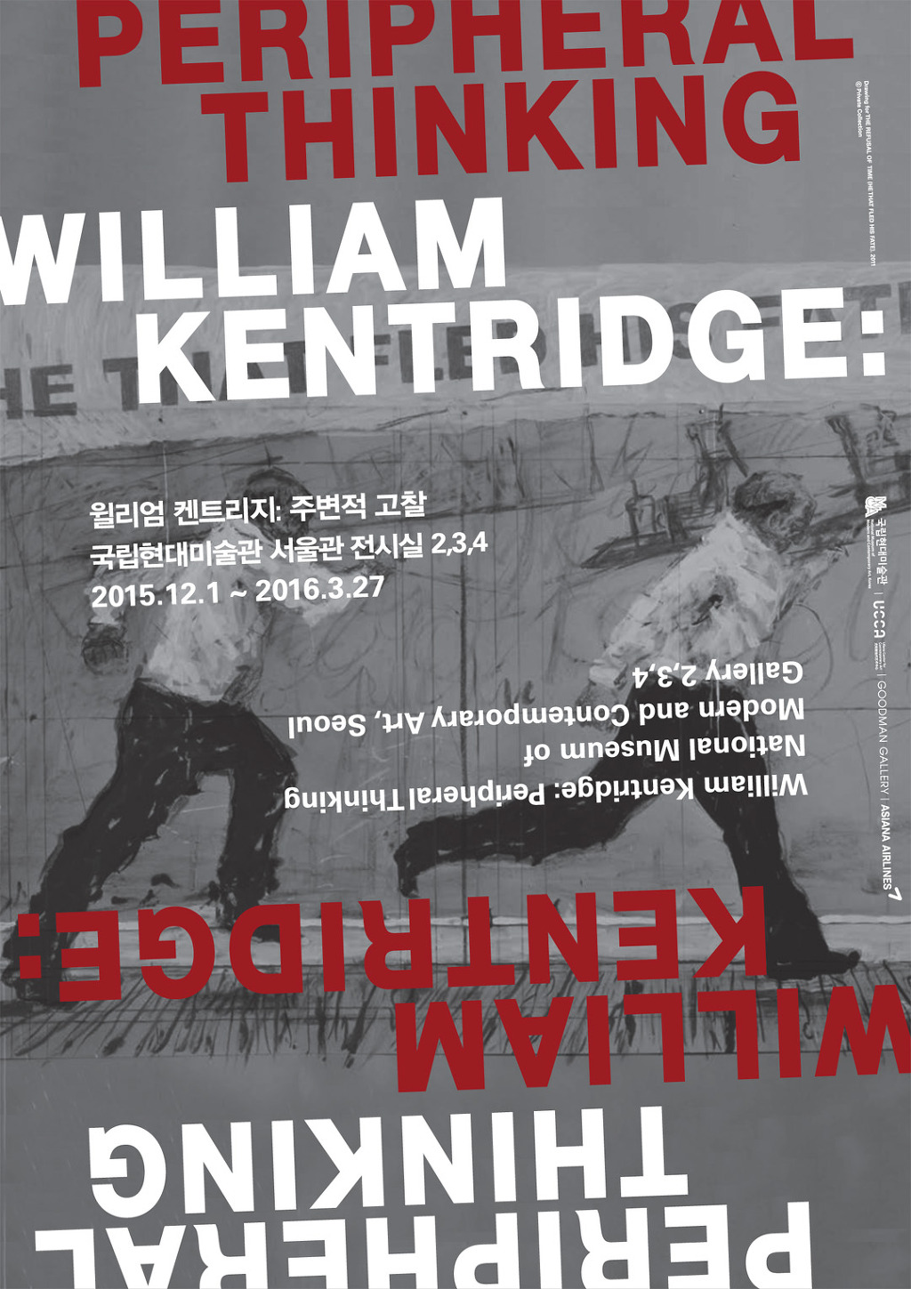 남아프리카 공화국 출신의 세계적 아티스트 윌리엄 켄트리지의 개인전 <윌리엄 켄트리지- 주변적 고찰 William Kentridge-Peripheral Thinking>이 국립현대미술관 서울관에서 열렸다. 국내 최초로 개최되는 이번 전시는 그의 초기작부터 최근 작품까지 총 망라할 수 있는 좋은 기회를 제공하며2016년 3월27일까지 진행된다. 작가의 렉처 퍼포먼스 제목에서 따온 전시 타이틀 '주변적 고찰'은 한 주제에서 자유롭게 연상되거나 확장되어나가는 사고의 흐름을 뜻한다고 한다. 다방면에 걸친 이해와 지식을 바탕으로 음악, 역사, 미술, 공연이 어우러진 그의 예술적 표현과 사유를 폭넓게 조망하는 전시는 [<망명중인 펠릭스>, <사랑이 충만한 캐스피어>, <다른 얼굴들>, <블랙박스/샹브르 느와>, <시간의 거부>, <나는 내가 아니고 이 말은 내 말이 아니다>, <양판희에 대한 메모>, <간접 독서>, <더 달콤하게, 춤을>의 컷아웃]으로 구성되어 있다. 이 중 일부를 적어보고자 한다.