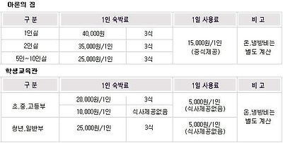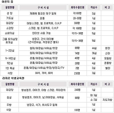 아론의 집은 종파를 초월하여 모든 일반인이 이용할 수 있고, 라자로 학생교육관은 초,중,고등부 학생 및 청년,일반부를 대상으로 하며 취사가 가능한 콘도형 시설입니다.