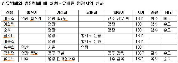 영광 지역 신자들의 수가 7명으로 전라도에서 세 번째로 많았고 또한 처벌된 신자들의 수도 처형된 자 3명과 유배된 자 2명을 합쳐