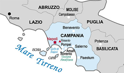 남부 최대의 도시 나폴리는 캄파니아Campania주의 주도이고 나폴리만Golfo di Napoli에 위치한 아름다운 항구도시입니다. 다른 이탈리아 남부 도시들과 마찬가지로 도시의 기원은 그리스계 식민도시로부터 시작되었고 그리스인들이 부르던 이름은 네아폴리스Neapolis(‘새로운 도시’라는 뜻)였습니다. 지도에서 보시다시피 나폴리는 베수비오 화산volcano Vesuvio 가까이에 위치하고 있고 이 화산은 보다 가까이 있는 다른 도시, 로마시대 번영하던 폼페이와 헤르쿨라네움을 파괴해버린 그 유명한 화산이죠.