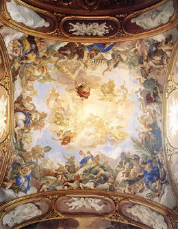 아래쪽에서 보면 하늘이 뚫린 듯 그리는 것이 바로크 천장화의 특징인데 이 천장화도 같은 방식을 따르고 있습니다. 가운에 천사들이 빨려 들어가는 금빛 창공은 영광된 신의 나라를 암시하고 있죠.