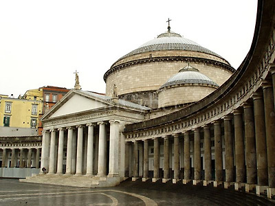 플레비시토 광장(Piazza del Plebiscito)의 산 프란체스코 디 파올라San Francesco di Paola. 이 19세기 교회는 로마의 판테온을 연상시킵니다. 전면을 덮는 드럼과 넓은 돔, 삼각 페디먼트를 가진 주랑 현관이 둘의 유사성을 뚜렷이 하고 있죠. 한편 교회 양쪽에서 뻗어 나와 광장을 둘러싼 열주는 역시 로마 산 피에트로(Piazza di San Pietro) 광장의 유명한 열주랑을 닮았습니다.