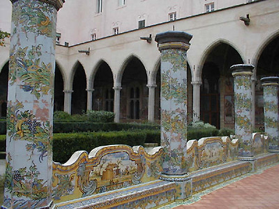 산타 키아라Santa Chiara 수도원의 회랑. 14세기의 교회인 산타 키아라에는 앙주 왕가의 무덤들이 있어 유명합니다. 사진은 인접해 있는 수도원의 안뜰인데 보시는 바와 같이 화려한 색채의 마욜리카Majolica 타일로 장식되어 있습니다. 타일의 그림은 전원 생활을 묘사하고 있습니다.