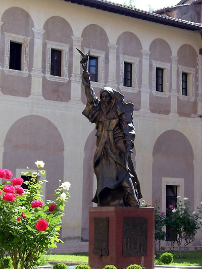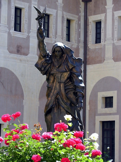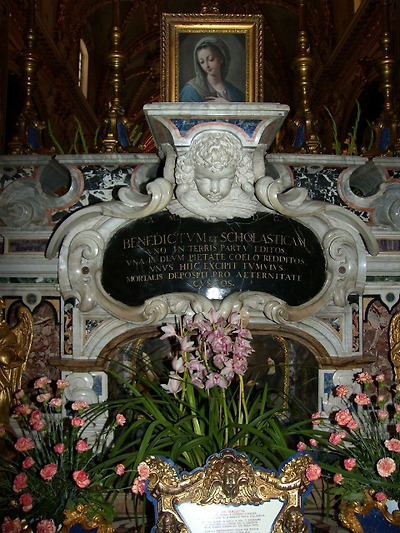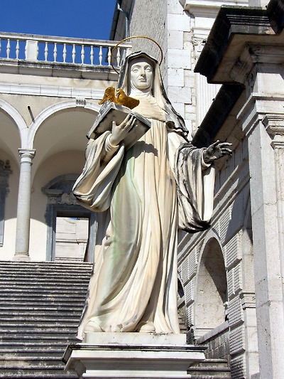 수비아코에 있는 성녀 스콜라스티카 수도원 안마당에 세워져 있는 스콜라스티카 성녀상이다. ㅁ자 건물로 둘러싸인 안마당