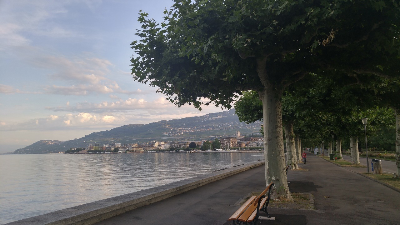 호스텔 식당에서 간단한 아침식사를 했습니다. 커피와 빵. 배낭에서 무거워 보이는 책과 약품, 침낭, 옷가지를 빼어서 라카에 넣고 배낭 무게를 줄였습니다. 몽트회(Montreux)에서 로잔까지 역 방향으로 걷기 시작했습니다. 거리는 31km. 일부를 제외하고 호수 가를 따라 도시가 연결된듯했습니다. 아직 해는 뜨지 않아 호수 건너편 프랑스 마을 불빛이 반짝였습니다. 어제 피곤해서 건성으로 보았던 호수와 건너편 산들이 아름다운 모습으로 펼쳐져 있었습니다.