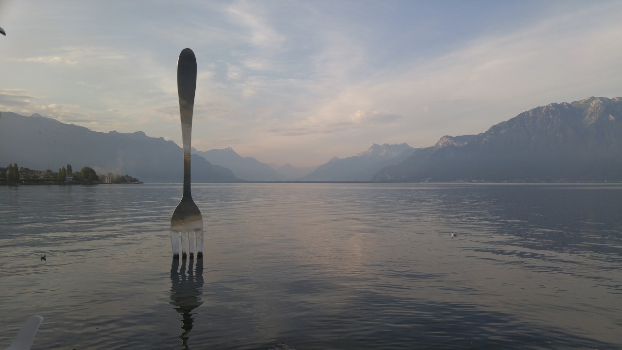찰리 채플린의 동상이 있는 랄리몽따리움 (l’Alimentarium) 광장 앞 호수에는 커다란 은색 포크가 꽂혀 있었습니다. 스테인레스 스틸로 만든 은색 라 푸셰트(La Fourchette)라는 기념물입니다. 8m 높이에 1.3m의 폭입니다. 1995년 임시로 세워진 이 포크는 당국의 설치허가를 받지 못해 철거되었다가 많은 우여곡절 끝에 2007년 영구설치 허가를 받고 비베를 상징하는 기념물이 되었습니다. 2014년 세계에서 가장 큰 포크로 기네스 북에 기재되었습니다. 뉴욕의 자유 여신상이나 코펜하겐의 인어와 같은 지위를 받은 것입니다.