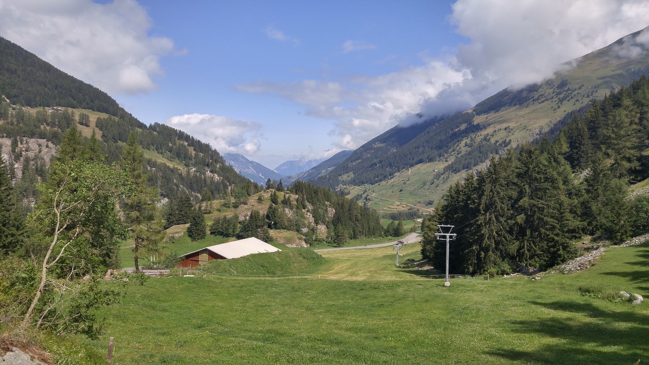 부흑 생 삐에흐 (Bourg Saint Pierre) 마을에 가까워지자 로헤트 텔레스키 리프트가 있었습니다. 길지 않은 스키 스로프는 아이들이 스키를 배우기 좋은 위치였습니다. 경사도가 완만해서 꼬마들이 저속으로 스키를 익힐 수 있는 곳이었습니다. 텔레스키는 활주스키 리프트라고도 합니다. 스키를 신고 눈 위에 서 있는 사람을 고지대까지 끌고 올라가는 시스템입니다. 의자나 곤돌라 식처럼 사람을 들어 올려 이동하는 것이 아닙니다. 대체로 설치와 운영이 간단한 시스템이고 요금이 저렴합니다. 한 여름이니 슬로프에는 풀이 자라 있어서 소들이 풀 뜯으러 몰려올 것입니다. 스키장 가장자리를 따라 올라갔습니다.