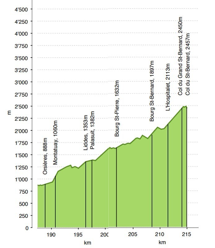 해발 1000m 가 넘는 지역의 일기는 불순합니다. 맑다가도 언제 눈이나 비가 쏟아질지 모릅니다. 비 오는 날이면 몸을 날려버릴 만큼 강풍도 동반하는 경우가 많습니다. 웬만한 우비는 무용지물이 됩니다. 산 길에서 찬비를 맞으면 체온 유지에 각별하게 주의를 기울여야 합니다. 거친 오르막 길에 비 피할만한 곳이 마땅치 않습니다. 아래 그림은 오흐시에흑에서 생 베흐노까지 고도 프로파일입니다. 주로 유월 중순이나 팔월 말이면 이곳은 환절기여서 날씨가 요동칩니다. 리드(Liddes) 에서 생 베흐노 고개 까지 구간에서 비 맞아 산행을 포기한 경우가 가끔 보고됩니다. 체온이 내려가면 계속 걷겠다는 미련을 버리고 버스나 차량을 구해서 따뜻한 곳으로 이동하는 것이 현명합니다. 특히 60대 이상이면 생리적으로 회복이 더디어 저체온증 대비는 필수입니다.