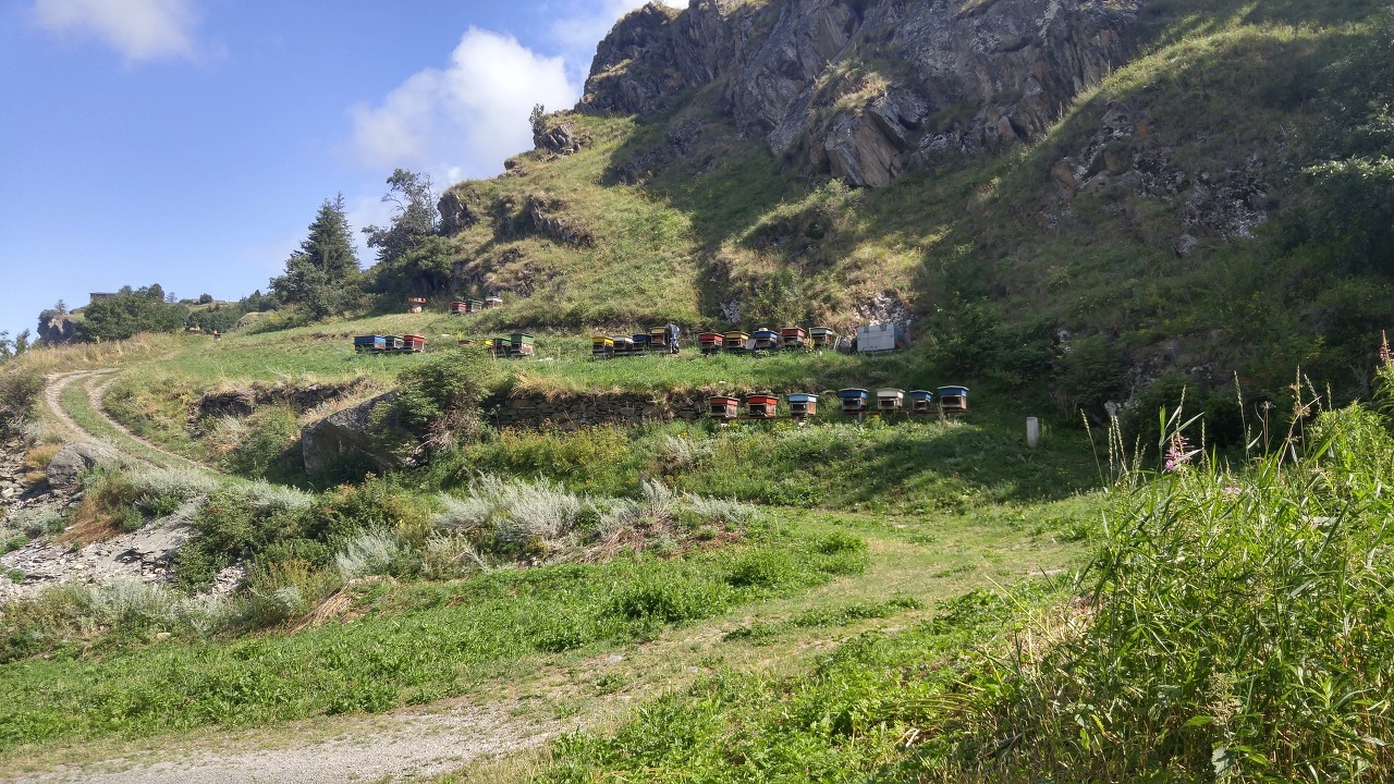 구름이 많은 날씨였어도 해가 드니 발 동트헤몽 (vsl d'Entremont) 고원지대 경치는 깨끗하고 아름다웠습니다. 남쪽 방향 멀리 하얗게 눈덮인 봉우리에 구름이 멈칫거리다가 넘어갔습니다. 길 가에 피어 바람에 흔들리는 수많은 작은 꽃들, 억세게 자란 풀들, 그리고 근엄하게 자리를 지키는 키 큰 침엽수들. 가끔 숲을 지나기도 했습니다. 줄 지어 놓여 있는 벌통은 주인이 보이지 않았습니다. 꽃이 피는 시기에 알프스 산중에 벌통이 많습니다. 이 높은 고원은 농약 칠 일이 없으니 꿀은 청정식품일 것입니다. 작은 마을을 지나고 자동차 길을 건너 21번 도로 왼쪽으로 길이 나 있었습니다.