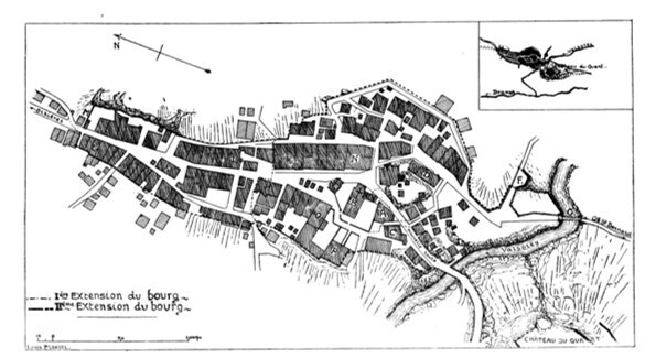 오베르게 오 쁘띠 빌랑(Auberge "Au Petit Vélan")이라는 호스텔에 들어가 배낭을 내려 놓았습니다. 소시지 스파게티, 맥주로 점심. 깊은 Valsorey 협곡 위에 놓인 아치형 다리, 협곡을 지키기 위한 돌무더기 요새. 오래된 물레 방앗간. 마을 생 삐에흐 성당, 로마시대 이정표 기둥(Borne Milliaire) 등의 볼거리가 있었습니다. 아래 그림은 부흑 생 삐에 마을의 평면도 입니다. 협곡에 흐르는 Valsorey 개천이 마을 남쪽 경계선입니다.