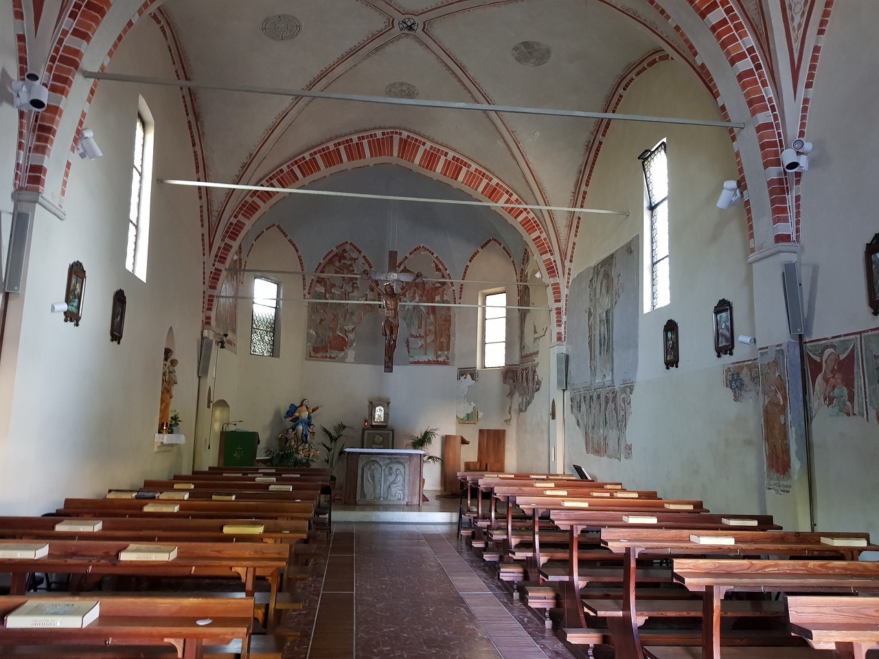 조용한 마을 발코나소(Valconasso)를 지나갔습니다. 가게와 바가 있는 인구 370명의 농촌마을입니다. 해발 72m. 잘 가꾸어진 생 울타리, 새로 지은 것처럼 보이는 집들이 길가에 있었습니다. 성모 몽소 승천 성당(Chiesa di Santa Maria Assunta)에 들어갔습니다. 아름다운 종탑과 어울리는 15세기 초에 지은 르네상스 시대의 건물이었습니다. 고딕 양식의 건물 파사드에 장미창이 있었습니다. 내부는 단일 회중석에 다섯개의 창으로 채광했습니다. 15세기 프레스코화가 벽을 장식했습니다. 화가는 누군지 모릅니다. 부드럽고 작은 시골성당에서 잠시 묵상과 기도의 시간을 가졌습니다. 성당 마당에 앉아 쉬는데 개가 쫓아와 짖어대자 개를 따라온 이웃집 청년이 쥬스와 초콜릿을 가져왔습니다. 감사한 마음으로 받고 그 가정의 행복을 빌었습니다.