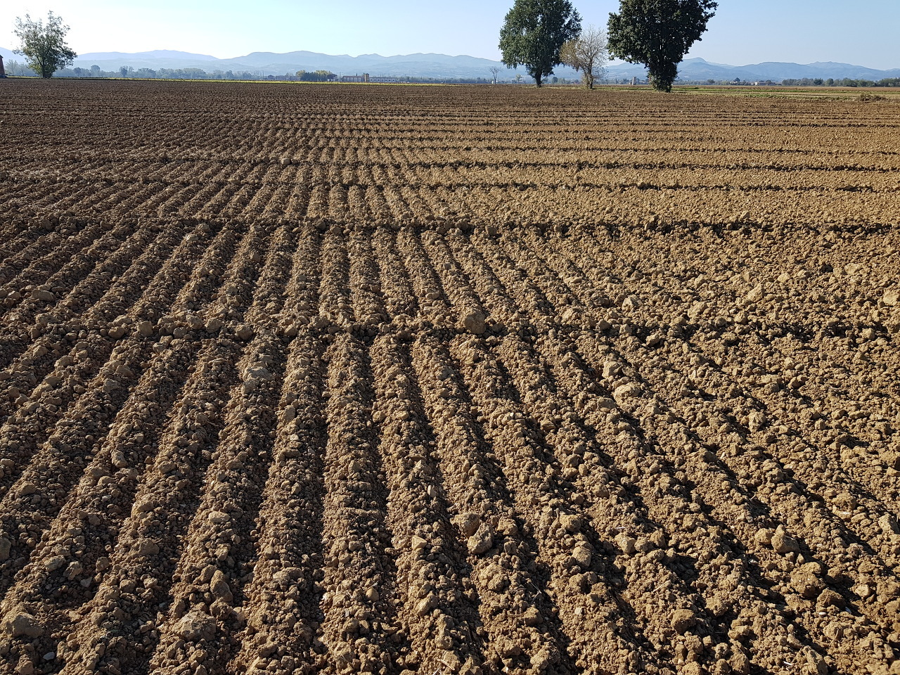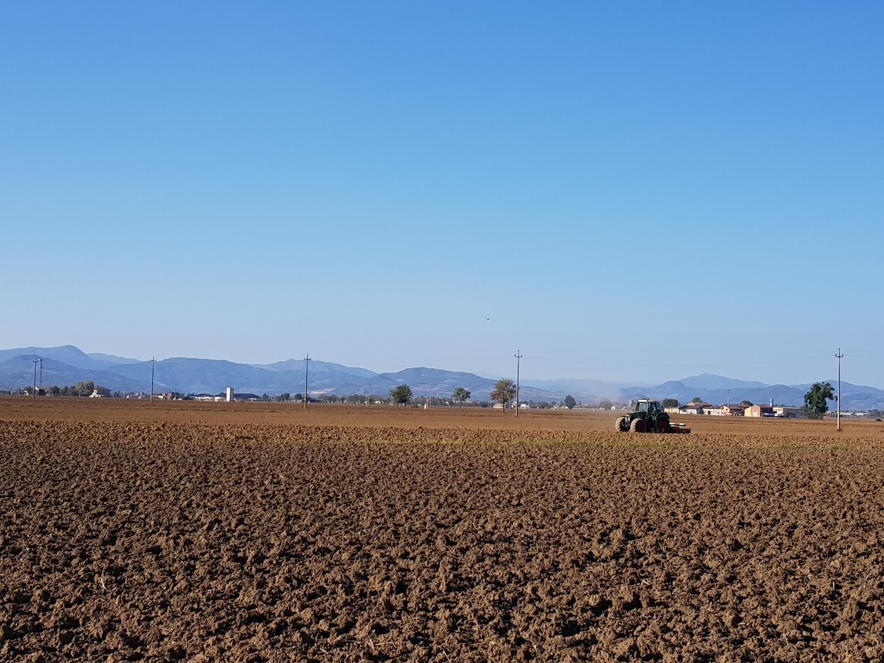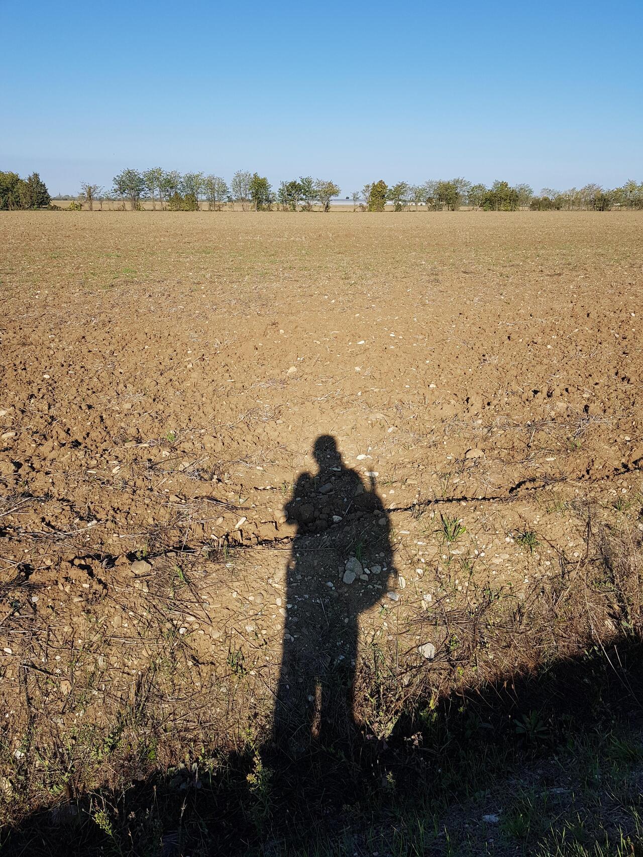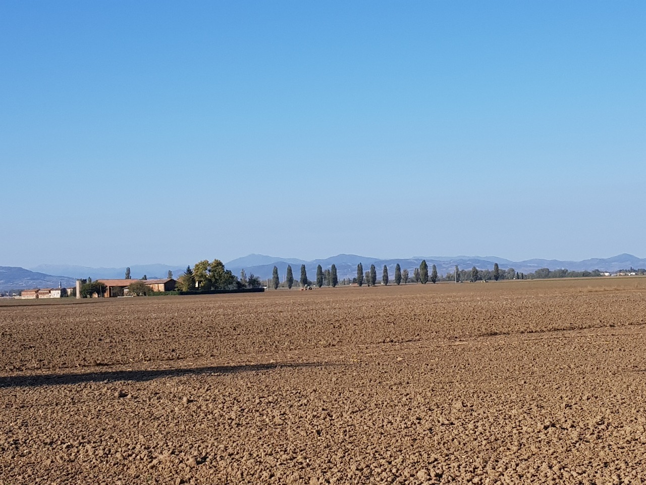 길은 남쪽으로 방향을 바꿔 아페닌 산 그림자를 향해 4 km 넘게 걸었습니다. 논 농사 들판을 빙 둘러 가는 비아 프란치제나 순례길에 인적이 없었습니다. 교통량이 많은 자동차 길을 따라 동으로 곧장 가면 피오렌주올라까지 7-8km는 단축될 것입니다. 인도가 없고 좁아서 위험한 길입니다. 들판으로 나서니 포강에서 멀리 떨어지니 아침 안개도 없고 건조한 공기가 상큼했습니다. 먼 산 그림자는 남쪽 끝 지평선에 병풍으로 있었습니다. 그늘 없이 탁 터진 들판 군데군데에 나무들이 서 있었습니다. 어렸을 적 호남평야라면 그 나무 그늘에 앉아 새참 먹는 농부들이 막걸리 잔이라도 들고 있을 것만 같았습니다. 그러나 들판은 인적 없이 비어 있었습니다. 자갈밭은 수확이 끝나고 붉은 흙더미에 나그네의 그림자가 지나갔습니다. 가을이었습니다. 멀리 보이는 푸른 산 그림자는 아페닌 산맥입니다. 포강 골짜기의 논 지역이 끝나고 밭이 시작되는 엉거주춤한 곳입니다. 포장도로여서 발바닥이 피곤했습니다.