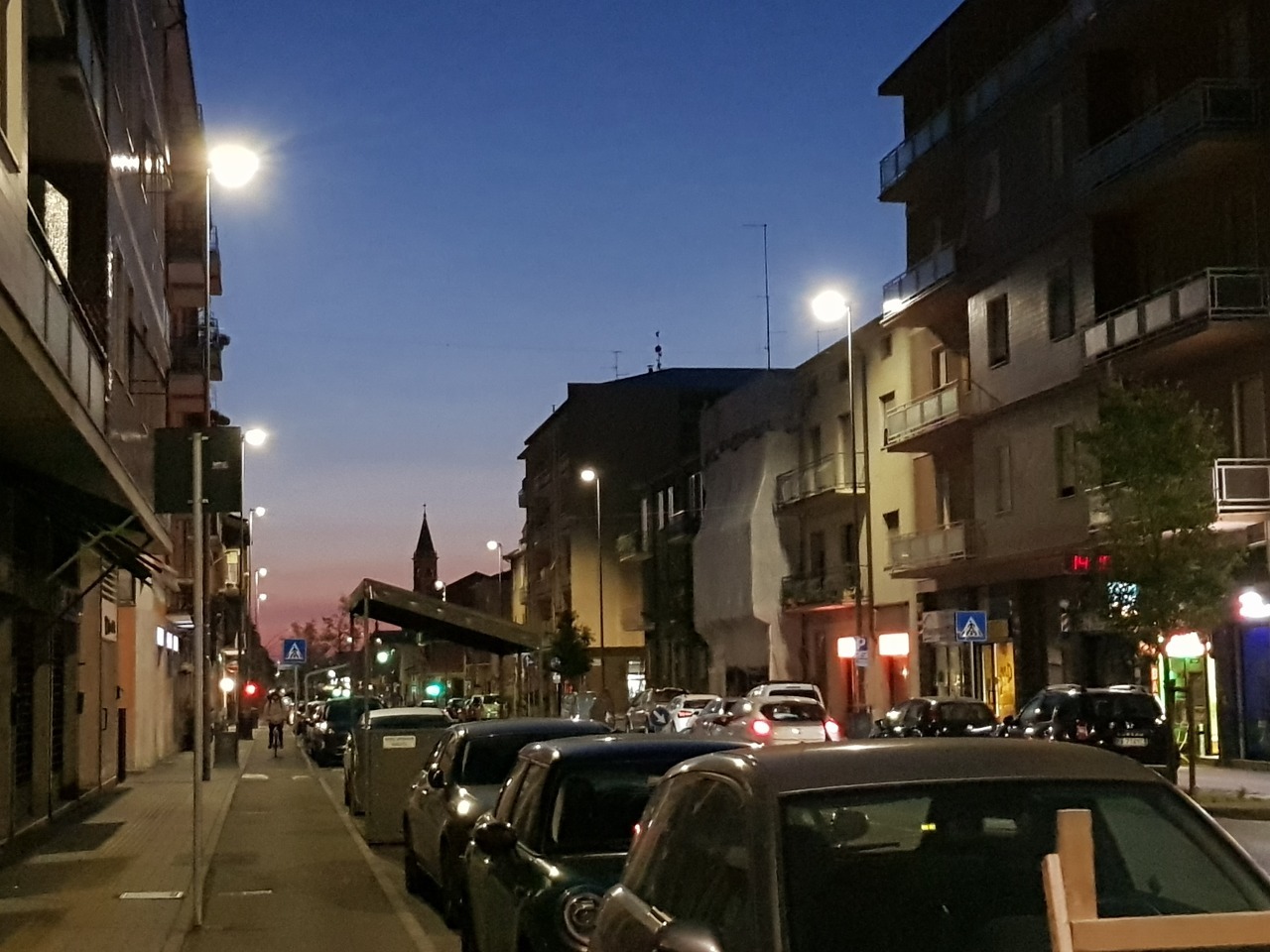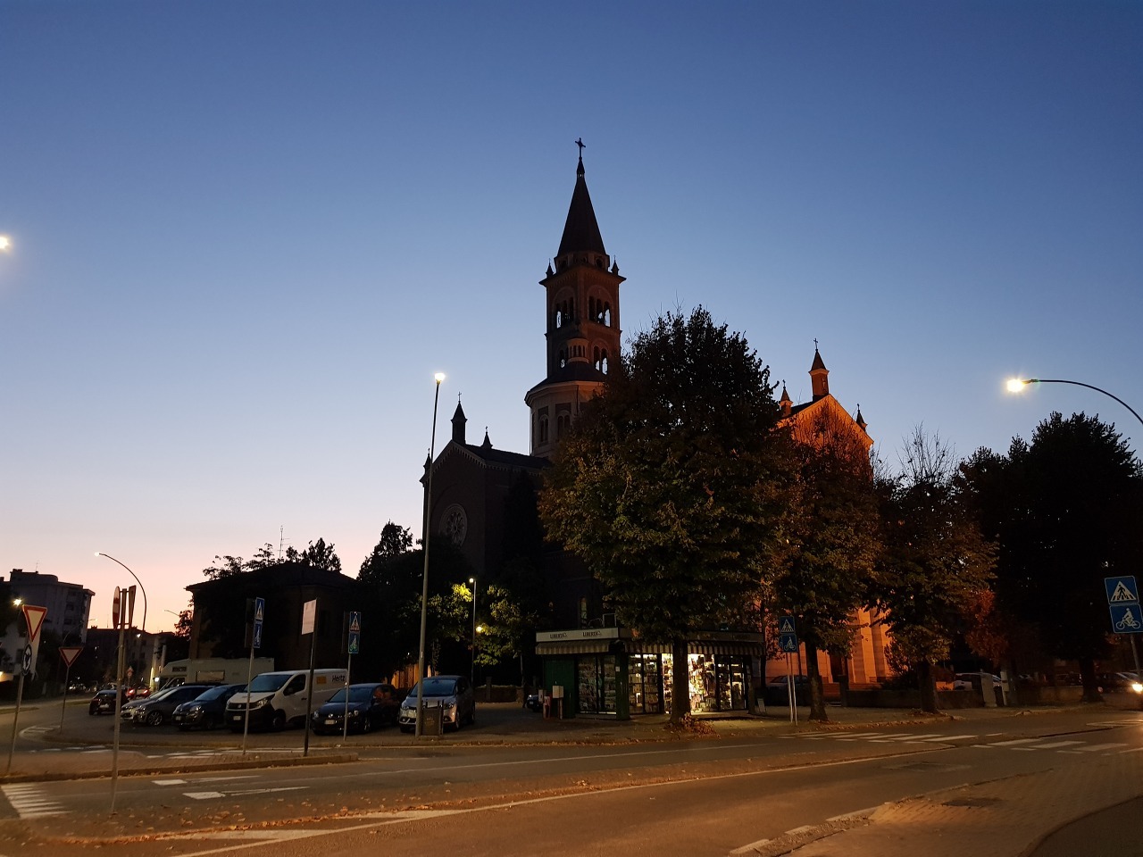 지구가 반 바퀴 돌고 난 새벽 여섯시 반, 피아첸자를 빠져나오는 아스팔트 도로는 길고 지루했습니다. 구시가를 피해 신시가지 거리를 걸었습니다. 비알레 단테 알기에리 거리(Viale Dante Alighieri)에는 고층 건물이 없었습니다. 2층이나 3층의 상가들이 동이 터오는 아침을 맞이하고 있었습니다. 출근하는 사람들, 학교 가는 아이들이 책가방을 지고 바삐 걸었습니다. 제 키만한 악기 케이스를 등에 진 아이도 그 대열에 끼었습니다. 붉은 동녁하늘을 배경으로 서있는 코르푸수 도미니 성당 (Parrocchia del Corpus Domini)앞에서 출발 기도를 바쳤습니다. 이 성당은 로마네스크 양식이지만 20세기초에 지었습니다. 피아첸자 도시 확장에 따라 지은 비교적 신축 건물입니다.
