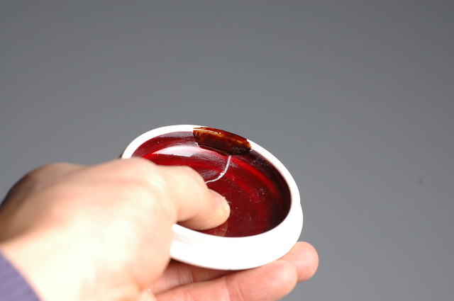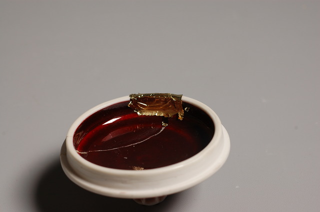 12) 오른쪽에 보이는 잔 안에 있는 것이 생칠에 등유를 희석해 놓은 옻칠입니다.