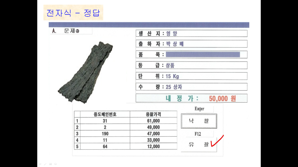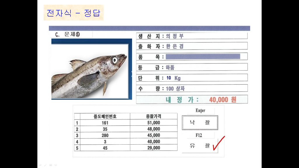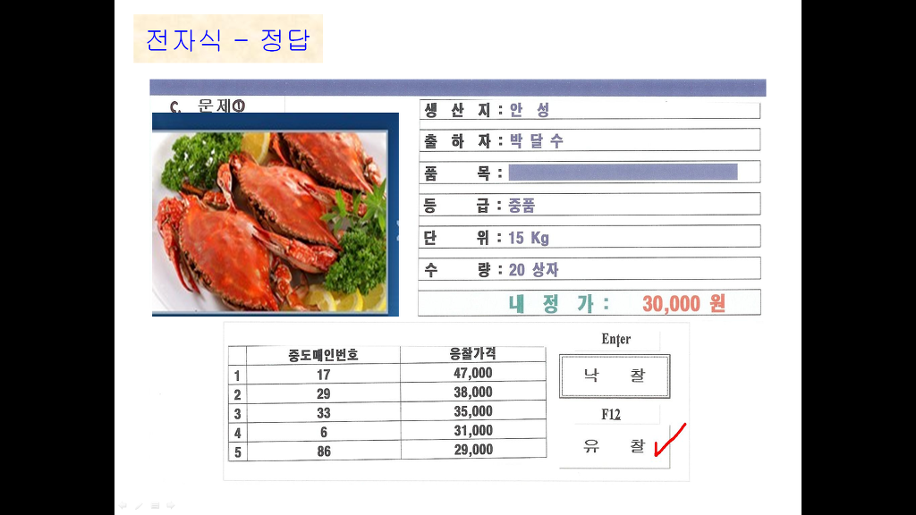 안녕하세요~~ 수산물 실기 관련해서 여쭤볼게 있어서 글 남겨요~~ 작성자파아란약속|작성시간18.05.11|조회수204 목록 댓글 0 글자크기 작게가 글자크기 크게가 경매사 선배님들한테 받은 자료에 있는 답안지인데..당췌 왜 유찰인지 답이 안 나오고 있습니다 ㅎㅎ내정가보다 최고가가 낮으면 당연히 유찰이지만, 내정가보다 높은데 왜 유찰인지..알 수 있을까요?? 다음검색 현재 게시글 추가 기능 열기 북마크 공유하기 신고 센터로 신고 댓글 댓글 0 댓글쓰기 답글쓰기 댓글 리스트