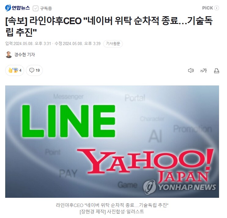 이데자와 다케시(出澤剛) 라인야후 최고경영자(CEO)는 지난해 11월 발생한 개인정보 유출과 이후 일본에서 실시한 행정지도에서 요구한 '네이버와 자본 관계 재검토' 논란과 관련해 "네이버와 위탁 관계를 순차적으로 종료해 기술적인 협력관계에서 독립을 추진할 것"이라고 8일 밝혔다.