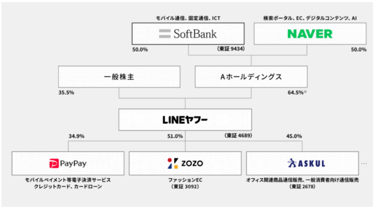 - 합병 구조는 네이버와 소프트뱅크가 A 홀딩스를 50 대 50 지분으로 만든 후, A 홀딩스가 라인 야후의 지 분 65%를 가지는 구조가 됨.