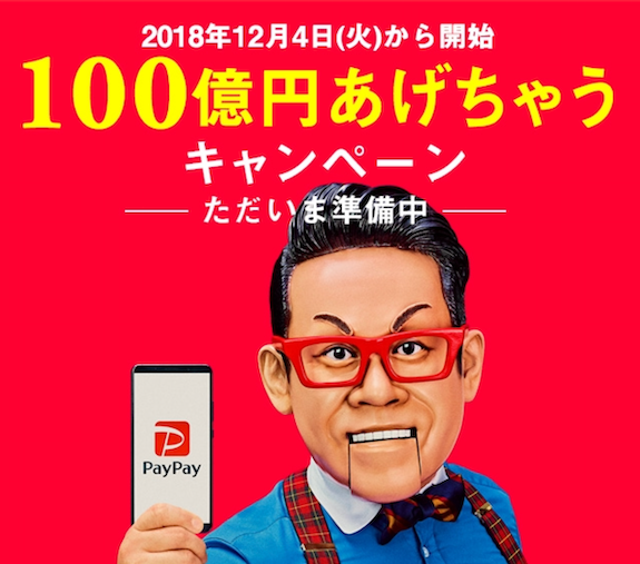 - '100억 엔 줘버리자 캠페인(100億円あげちゃうキャンペーン)'이 그것임.소프트뱅크의 페이페이 서비스 홍보문구 '100억엔 드리겠습니다' 캠페인
