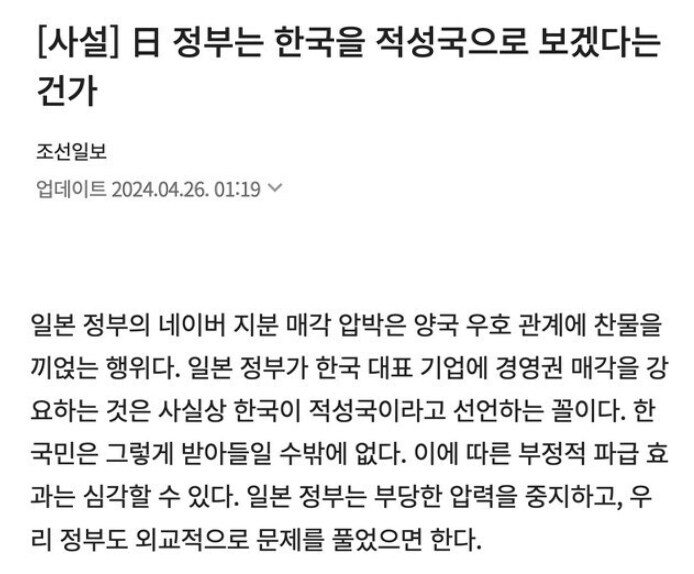 마이니치신문은 “메신저앱인 라인의 개인정보 유출 문제와 관련, 총무성은 3월과 4월에 운영회사인 라인야후에 각각 행정지도해, 그룹내 자본 관계의 재조정을 압박했다”며 “소프트뱅크와 함께 사실상의 라인야후 모(母)회사인 한국 IT대기업 네이버에 의한 ‘(경영) 지배’를 없애려는 노림수이며, 일본 정부가 민간기업의 자본 구성에 관여하는 건 이례적인 조치”라고 보도했다.