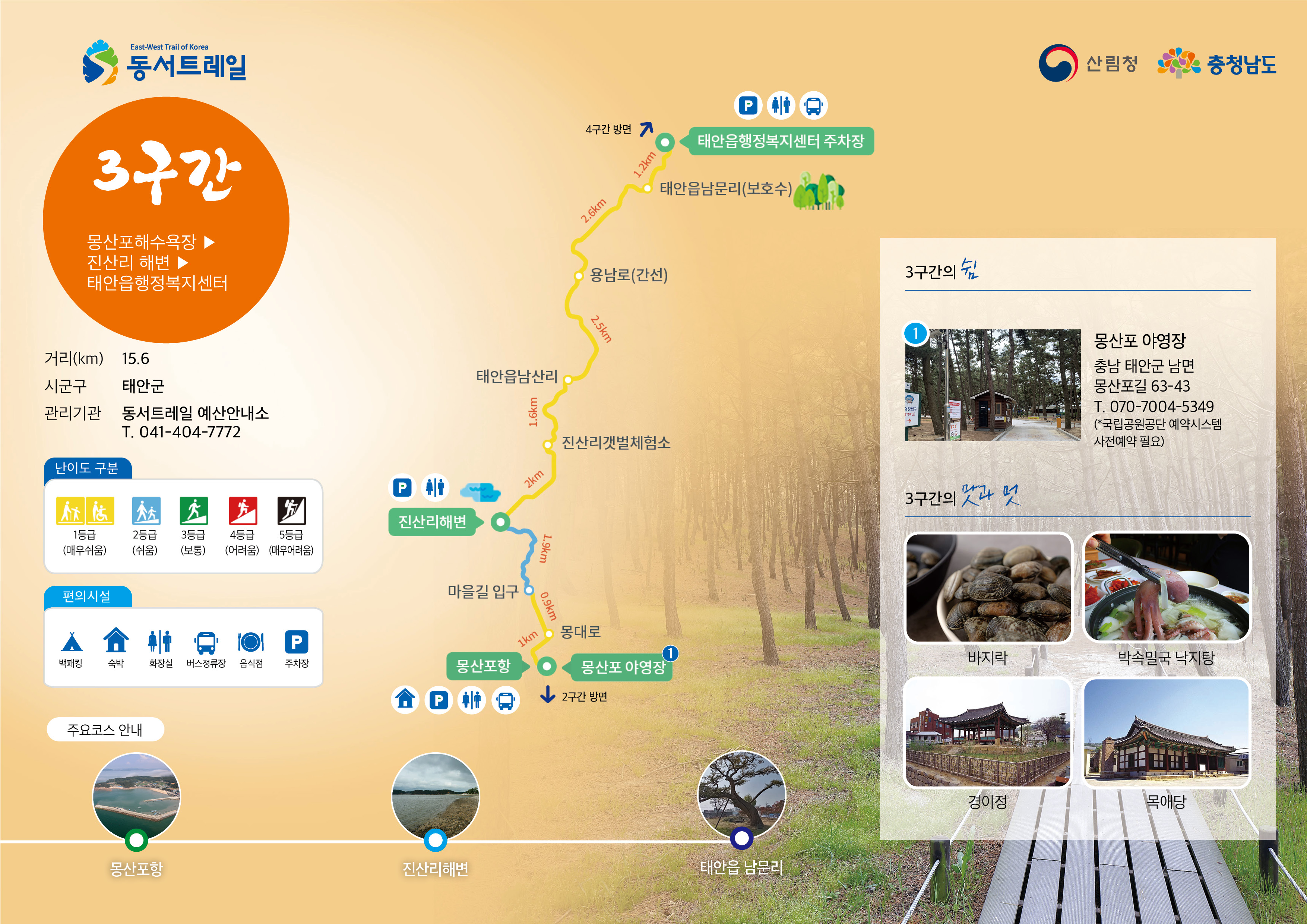 몽산포해수욕장에서 진산리 해변을 거쳐 태안 읍내로 이어지는 구간으로 태안의 해안경관을 즐기며 걸을 수 있는 마지막 구간입니다.